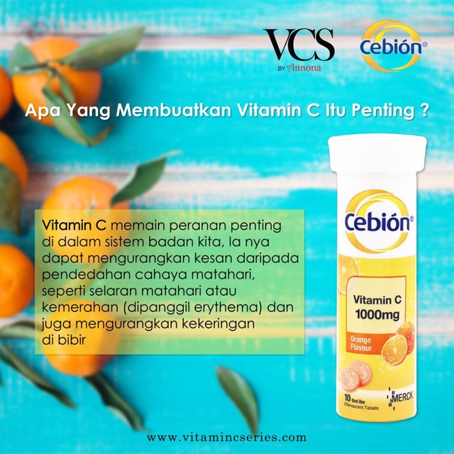 Cebion Effervescent Vitamin C 1000mg 4x10s. Cara terbaik ialah mengambil makanan yang kaya vitamin C dalam keadaan mentah seperti buah-buhan segar yang baru dipetik kerana proses merebus atau mengukus makanan akan mengurangkan kualiti vitamin sehingga 25. Ada banyak sumber vitamin C mulai dari buah dan sayuran hingga suplemen.
